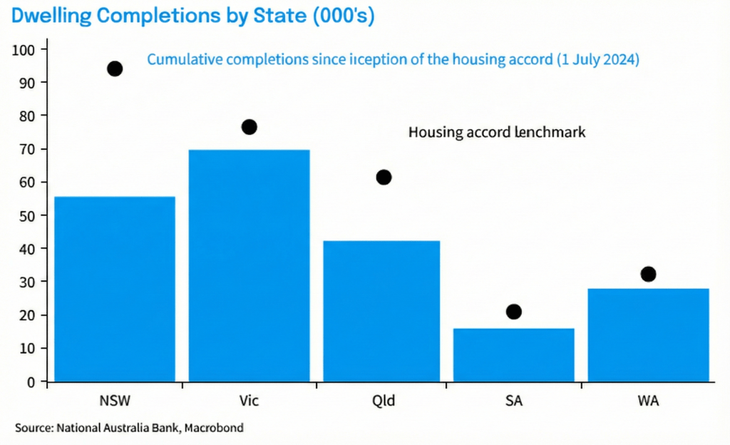 Across NSW, Victoria, Queensland, South Australia and Western Australia, actual completions are falling well short of the implied Housing Accord benchmarks.