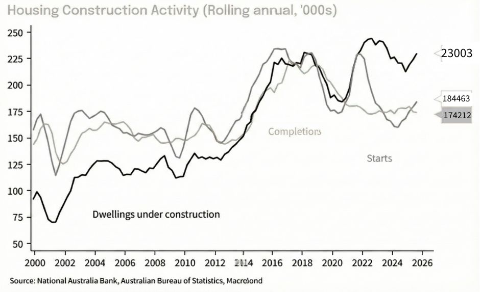 - The pipeline of dwellings under construction is elevated, sitting around 230,000 homes — well above pre-pandemic norms.